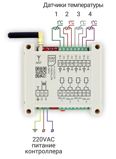 При температуре датчика ниже установленной границы либо выше установленной границы контроллер отправляет СМС на телефонные номера пользователя. Если температура возвращается в границы, контроллер отправляет СМС на телефонные номера пользователя. СМС отправляется при выходе и при возвращении в установленны диапазон температуры любого из датчиков, в смс содержится текущее значение температуры всех датчиков. После отправки СМС, контроллер обзванивает всех пользователей, если функция звонков включена. Звонки прекращаются, если один из пользователей снял трубку.
